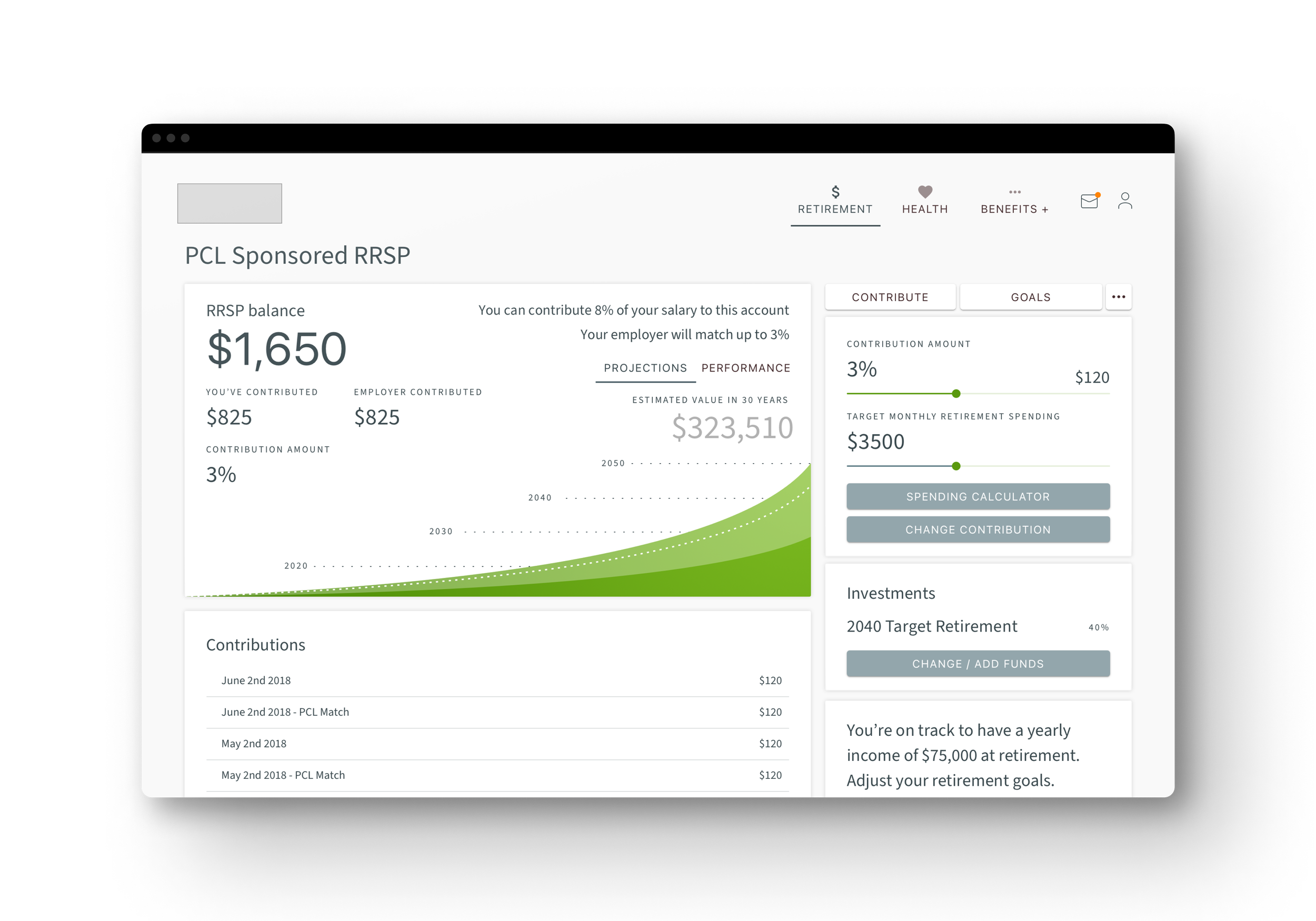 I designed many of the features for these products with the mental models and propensities of the client’s plan members (and people in general) when it comes to retirement savings in order to be able to nudge them to take positive actions to improve their retirement preparedness. These actions were also strongly aligned with the clients’ business objectives, in that they generally drove greater participation and higher deposits in their accounts. In our research, we found many plan members were both sheepish about not contributing as much as they felt they should and uncertain about what was “normal” to contribute. By simply highlighting when a plan member’s monthly contribution amount was less than the majority of others, this simultaneously provided a meaningful benchmark and provided a little social pressure to increase to meet that amount.